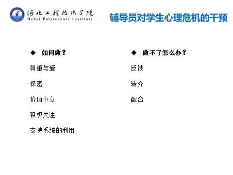 本次讲座的受众主要是辅导员,李佳丽老师在讲座的最后着重讲解了辅导员对学生心理危机的干预。首先,辅导员在与心理异常的同学沟通时要做到尊重与爱和价值中立,对访谈内容要做到保密,并对该学生做到积极关注,充分利用大学生心理健康教育指导中心的支持作用,如感觉该学生问题较严重则需要反馈给365官网心理健康教育指导中心。若心理咨询已无法帮助该学生,则需要转介到精神科或心理科。