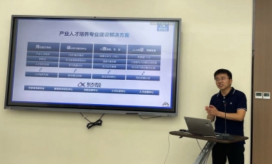 随后,科大讯飞王家波经理从企业角度阐述了产业人才培养专业建设解决方案。以“岗”为始、以“课”为径、以“证”为尺,构建全方位的人才培养体系。三段式培养模式“2+1+1”、项目化实践体系贯穿全培养周期、混合教学模式、创新型人才培养的师资团队,体现了专业特色建设。