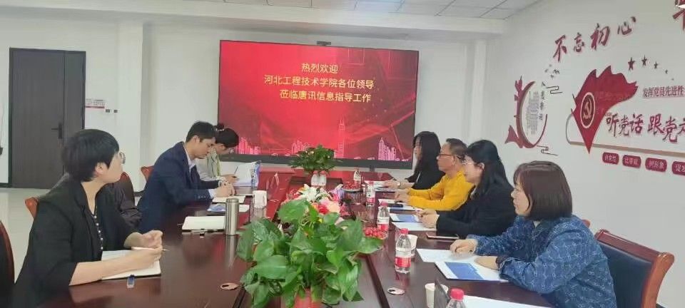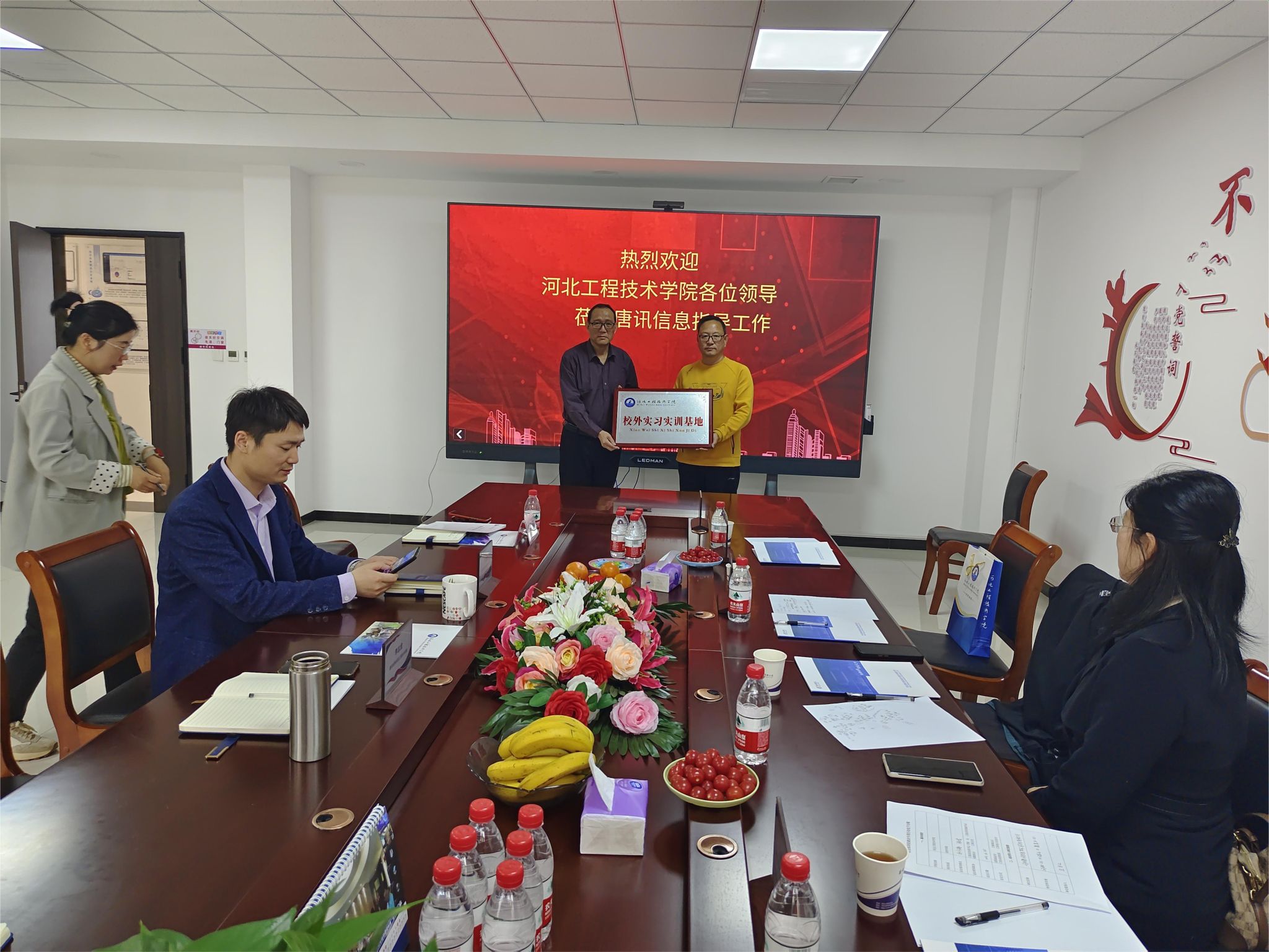 调研组首先来到位于新一代电子信息产业园区软件大厦四层的河北唐讯信息技术股份有限公司走访调研,在公司总经理王玉江、党支部书记李志虎、副总经理杨雅慧的陪同下,参观了公司发展历程荣誉展厅和新一代通讯技术产教融合成果展厅,听取了公司与省内外高校开展产教融合协同育人工作的情况汇报。参观结束后,校企双方举行了产教融合协同育人座谈会,并举行校企合作签约授牌仪式。365官网软件学院院长赵冬梅和河北唐讯信息技术股份有限公司副总经理杨杨雅慧代表校企双方签署了校企合作协议;对外合作部部长王俊昆为企业颁授“校外实习实训基地”牌匾。