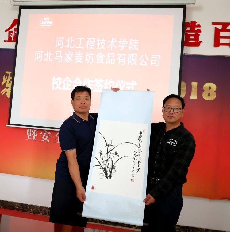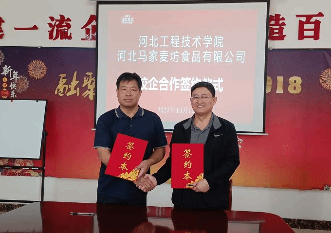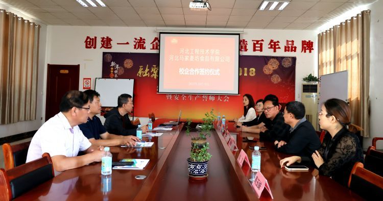 在签约仪式上,王俊昆部长首先对公司的信任支持和热情接待表示真诚感谢,对学校的发展历史、办学规模、办学定位做了简要介绍,希望进一步加强产学研合作,为校企合作的内涵建设奠定基础。河北马家麦坊食品有限公司董事长马建刚致辞中,对公司30多年的发展之路以及取得的成就进行简要的介绍,同时也表示校企合作是学校和企业共同发展的需要,也是企业反哺高校、推动高校教育事业发展的需要。