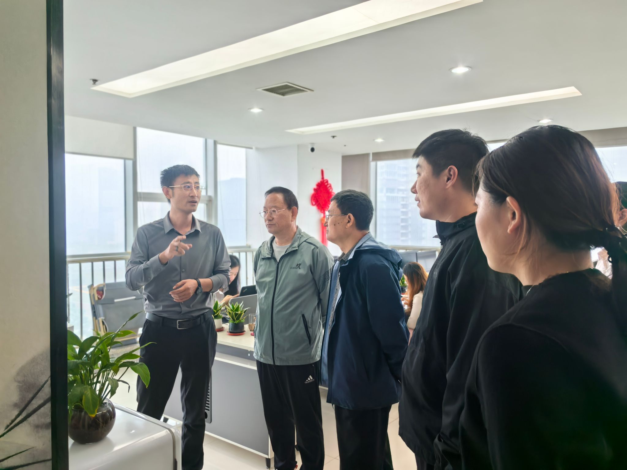 在公司总经理窦亮的陪同下,王明吉院长一行人参观了企业的办公场地、技术创新中心,并在会议室共同观看了企业宣传片。随后,双方就合作的模式及内容进行了深入地探讨和交流。