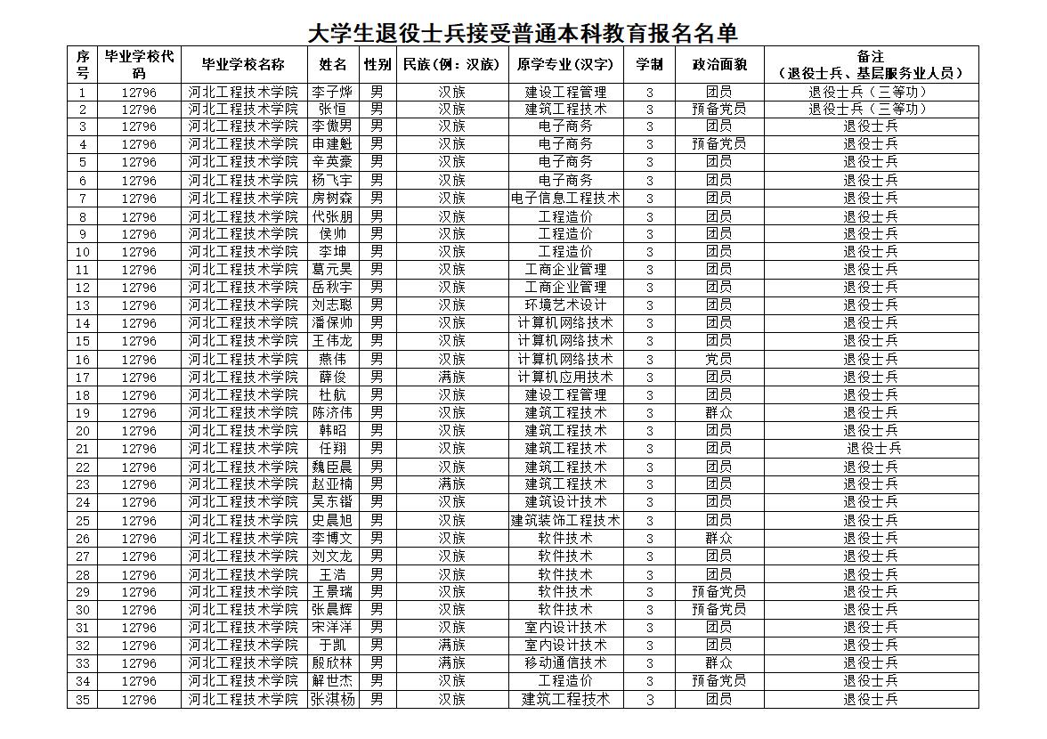 根据河北省教育厅《关于做好 2022 年河北省普通高校专科接本科教育考试选拔工作的通知》要求,现对退役毕业于河北省普通高校具有国家承认的普通专科(高职)学历且具有河北户籍的 2021年度退役士兵和退役后在河北省普通高校完成专科(高职)学业的 2022 年普通应届毕业生报名名单公示如下: