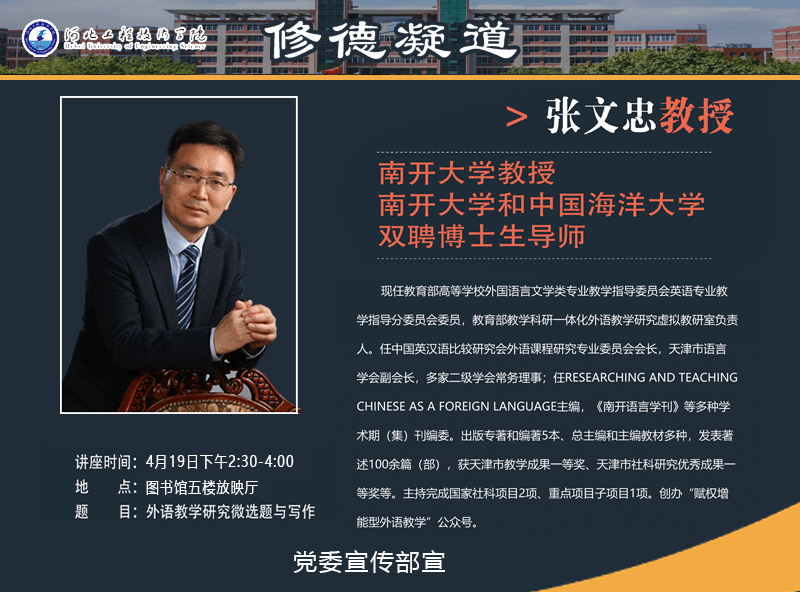 张文忠,南开大学教授,南开大学和中国海洋大学双聘博士生导师。现任教育部高等学校外国语言文学类专业教学指导委员会英语专业教学指导分委员会委员,教育部教学科研一体化外语教学研究虚拟教研室负责人。任中国英汉语比较研究会外语课程研究专业委员会会长,天津市语言学会副会长,多家二级学会常务理事;任Researching and Teaching Chinese as a Foreign Language主编,《南开语言学刊》等多种学术期(集)刊编委。