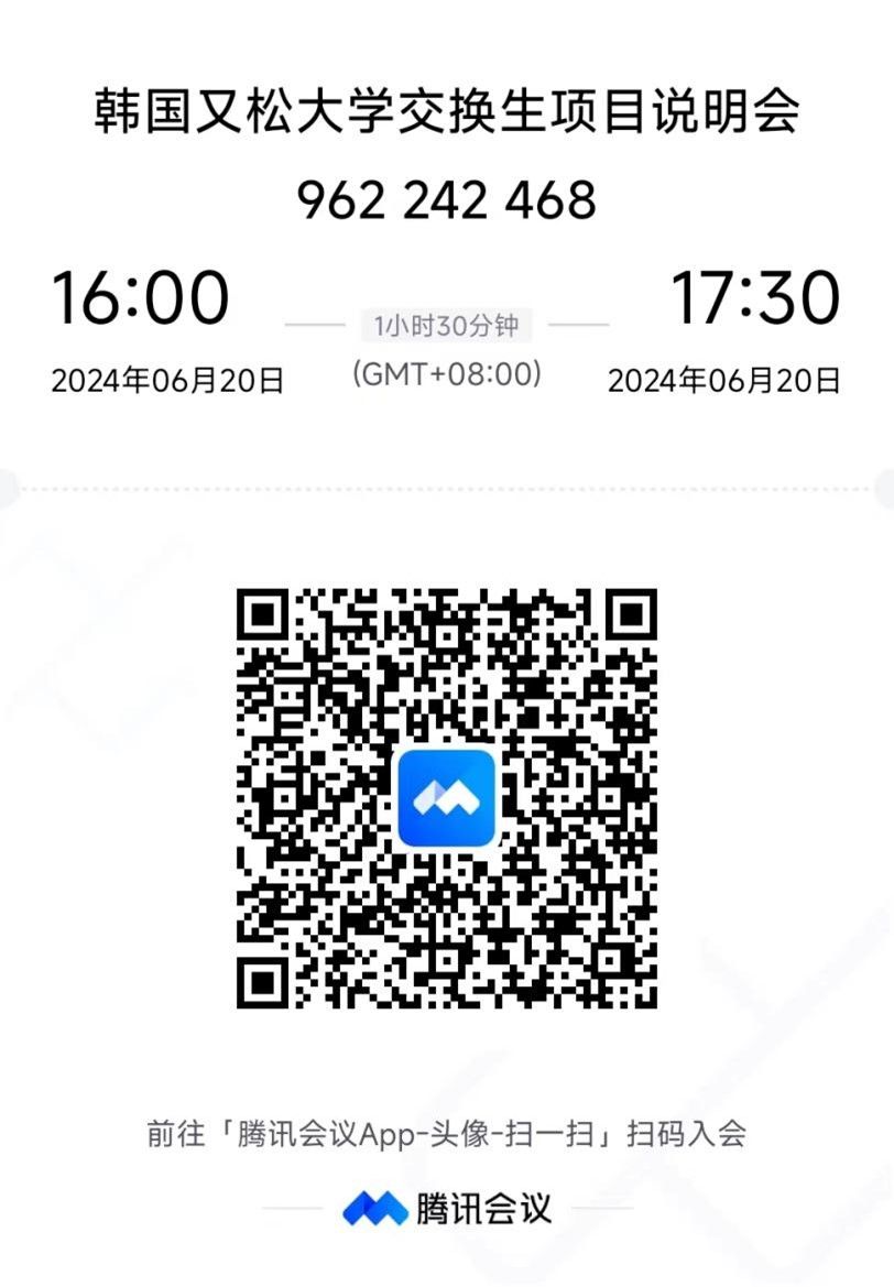 为方便学生了解又松大学情况及交换生注意事项,现于2024年6月20日下午16:00开展365英国上市官网与韩国又松大学交换生项目说明会(说明会为线上形式,请扫描附件腾讯会议二维码参会),会中将邀请2023年秋季赴韩国交换的学长学姐们分享他们的在韩经历,欢迎同学们积极参加。