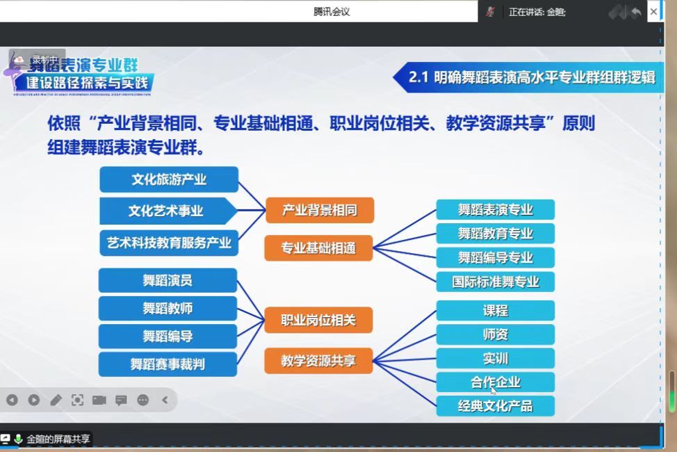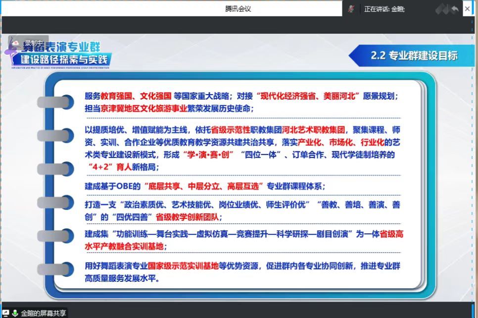 金暄教授分别从国家教育计划,学校教育事业规划以及舞蹈表演专业建设规划三个层面作细致讲解,并在“明确舞蹈表演高水平专业群组群逻辑”这一框题中,强调应依照“产业背景相同、专业基础相通、职业岗位相关、教学资源共享”四原则组建舞蹈表演专业群。在专业群建设目标这一框题中,金暄教授指出要服务“教育强国,文化强国”等重大国家战略;对接“现代化经济强省,美丽河北”愿景,规划担当“京津冀地区文化旅游事业繁荣发展”的历史使命,鼓励专任教师要用好优势资源,促进各专业协同创新,共同提升专业群高质量发展水平。