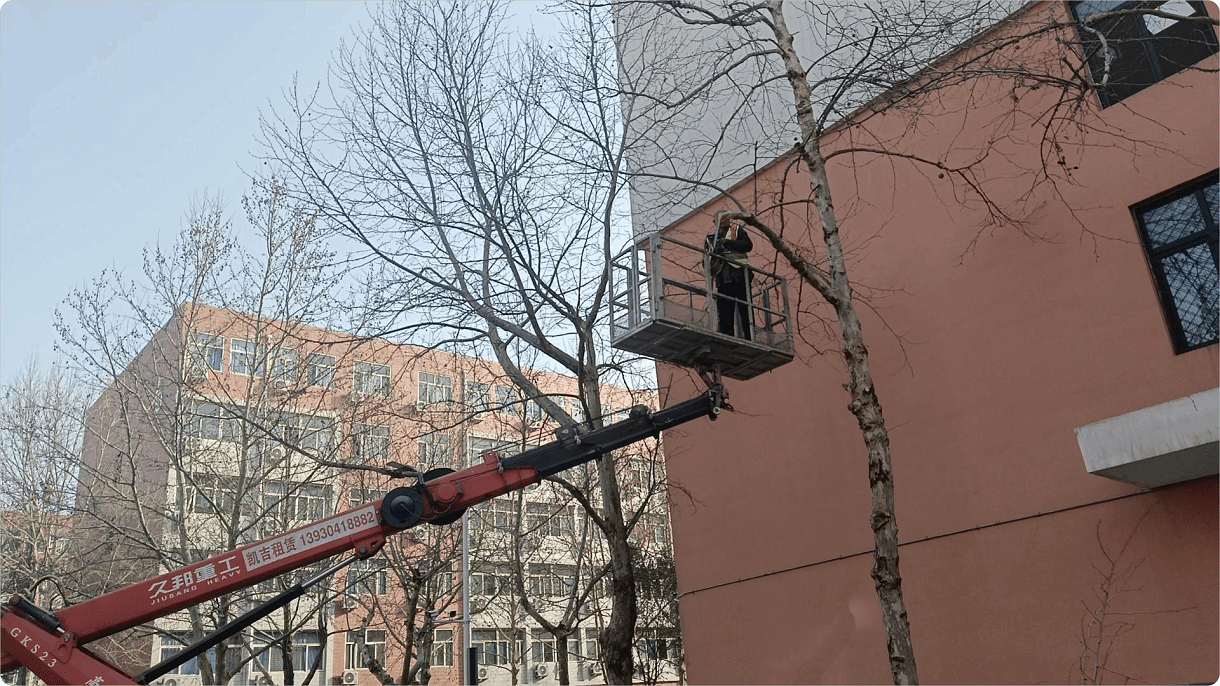 春季大风天居多,导致校园主次干道、绿化带等区域多棵树木树枝断裂脱落或折裂悬挂,后勤处及时组织绿化人员迅速协调高空作业车辆,按照先重点区域和主干道的原则,对树木高空树干、树枝断裂隐患点位进行“拉网式”应急排查并处理,消除了安全隐患。
