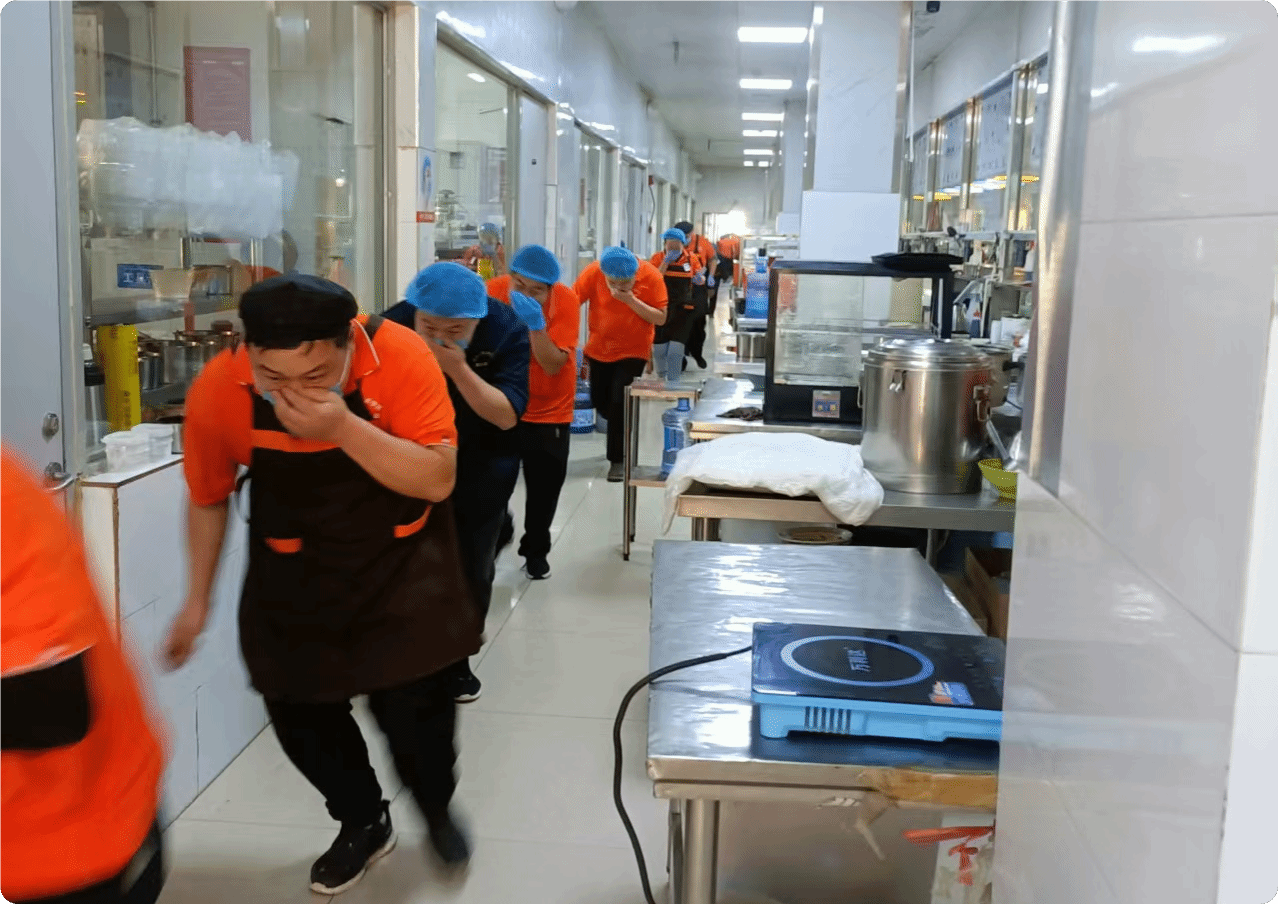 疏散逃生演练环节模拟了餐饮中心后厨突发火灾的场景。随着警报声响起,各部门迅速响应,引导人员立即组织大家用湿毛巾或湿布捂住口鼻,低姿前行,按疏散指示标志和安全出口标识的指示方向逃生,避免了拥挤踩踏事故的发生。