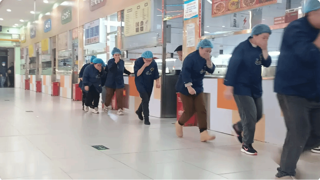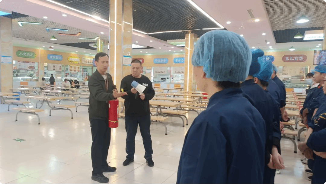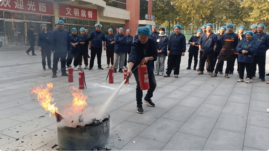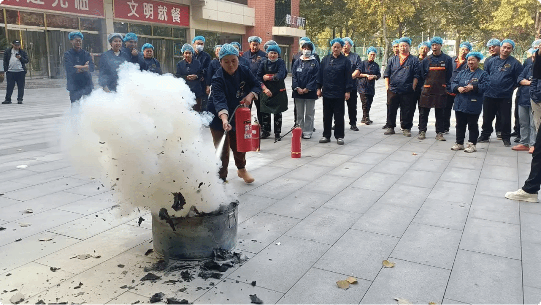 在疏散环节,员工们引导“就餐师生”沿预定路线快速撤离至安全区域,整个过程忙而不乱、井然有序。随后,全体人员在指定区域进行了灭火器实操训练,确保每位员工都能熟练掌握消防器材的正确使用方法。