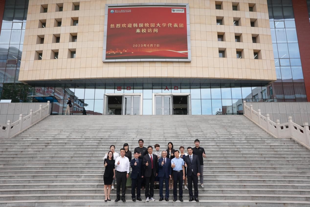 在签署框架协议,互赠礼品后,两校领导在图书馆前合影留念。随后,李望国副校长带领韩国牧园大学一行参观了校展室、图书馆、人工智能与大数据学院、网络与通信学院实验室以及音乐厅。