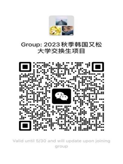 为方便学生了解又松大学情况及交换生注意事项,现于2023年5月25日下午16:00开展365英国上市官网与韩国又松大学交换生项目说明会,请同学们提前扫码入群。