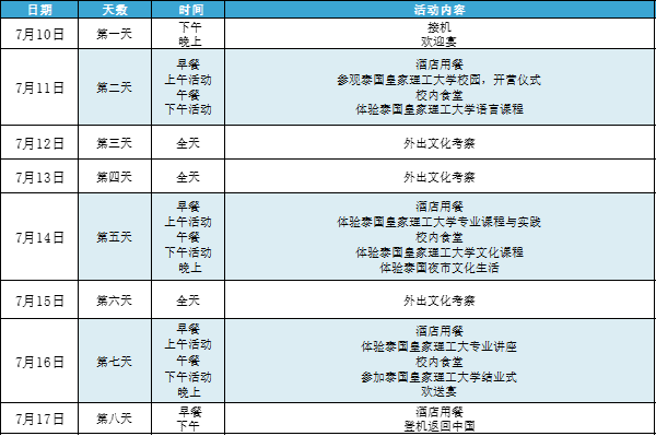 费用包含:8天住宿(泰国皇家理工大学校内酒店-双人间)、7天早餐及2次正餐、机场与活动接送服务、课程与讲座费用、文化考察门票及全程工作人员陪同。