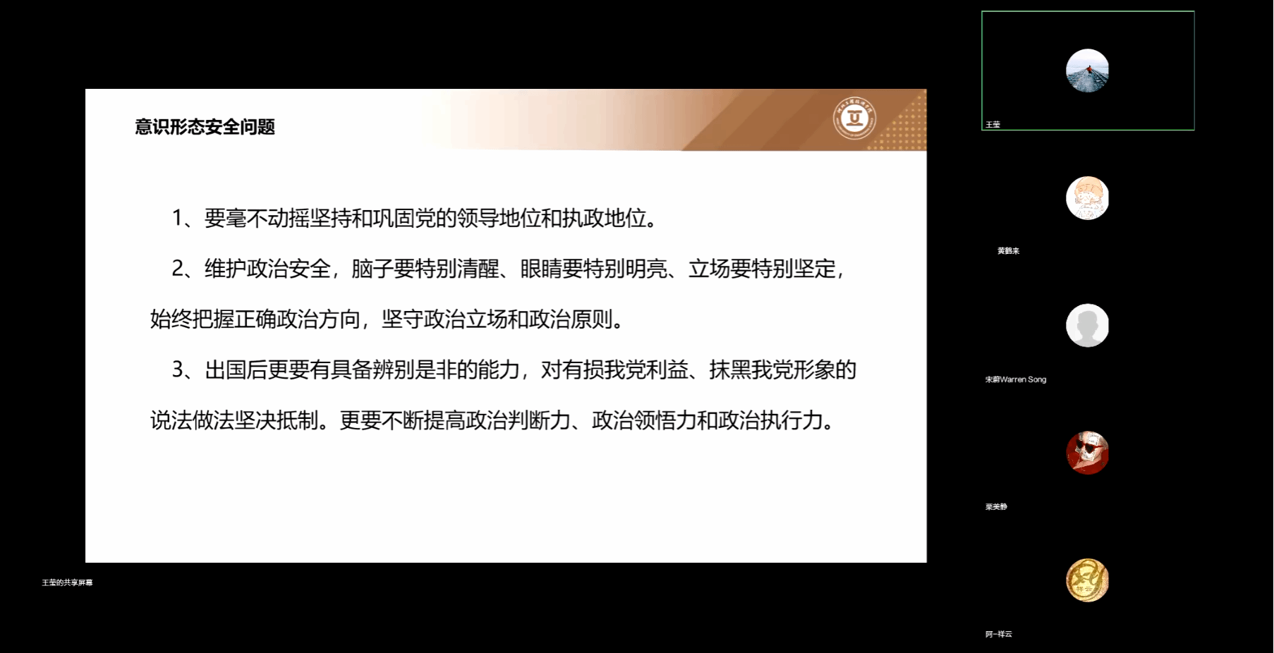 国际交流处副处长王莹围绕游学项目行前准备及游学期间注意事项展开详细讲解,内容涵盖行前准备、飞行须知、外事纪律、保密防范、人财物安全、意识形态等方面,并对纪律和安全问题进行了着重强调。