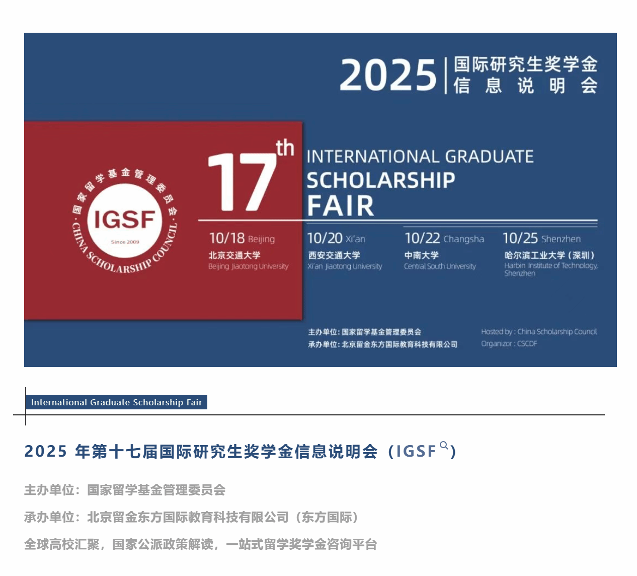 2025年10月,第17届IGSF活动将分别落地北京、西安、长沙、深圳四地,来自全球十多个国家/地区的众多优质院校/教育机构应邀参与,将继续为优秀学子与海外知名院校及机构搭建面对面交流的桥梁。学生报名通道已于9月1日正式开启,欢迎优秀学子积极报名参加!