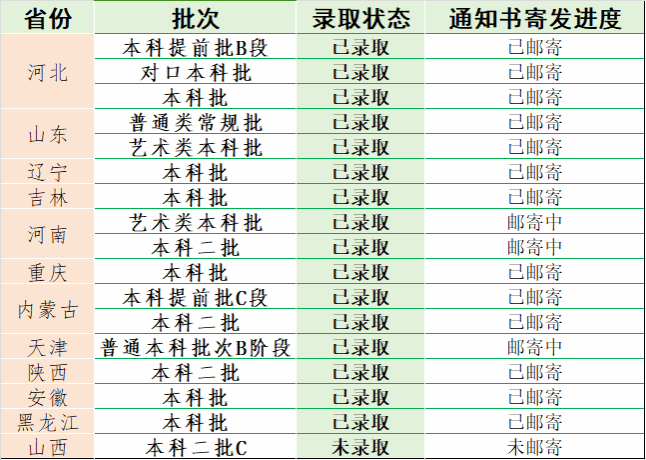 截至8月2日,365官网已完成对河北省本科批、本科提前批B段及对口本科批、河南省艺术类本科批及本科二批、重庆本科批、内蒙古本科提前批C段及本科二批、天津普通本科批B、陕西省本科二批、安徽省本科批、黑龙江省本科批、辽宁省本科批、吉林省本科批、山东省常规类及艺术类的招生录取和通知书邮寄工作,为方便各位考生查阅,现将各省录取情况公布如下: